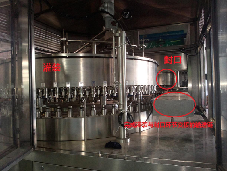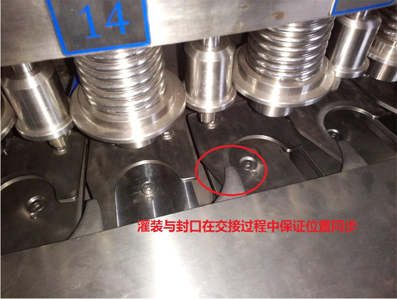 2、在運(yùn)行過程中始終保持工位一一對(duì)應(yīng),實(shí)現(xiàn)灌裝機(jī)和封口機(jī)位置同步,保證灌裝與封口環(huán)節(jié)的平滑交接,不影響罐內(nèi)液體容量偏差和保證罐體外形完好無損