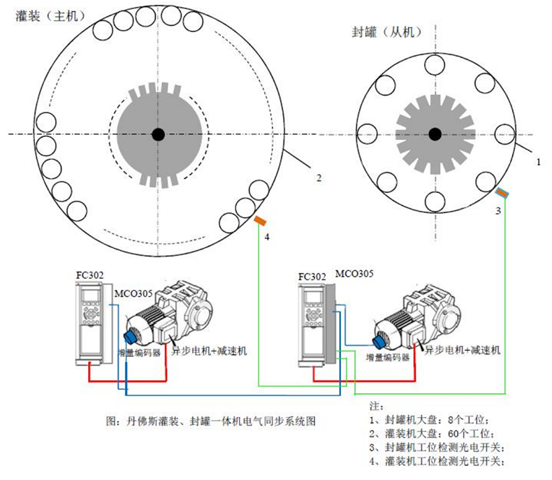 丹佛斯 FC302+MCO305 為灌裝封口組合機(jī)提供了易于安裝和調(diào)試的電氣同步解決方案,以下作詳細(xì)說明。