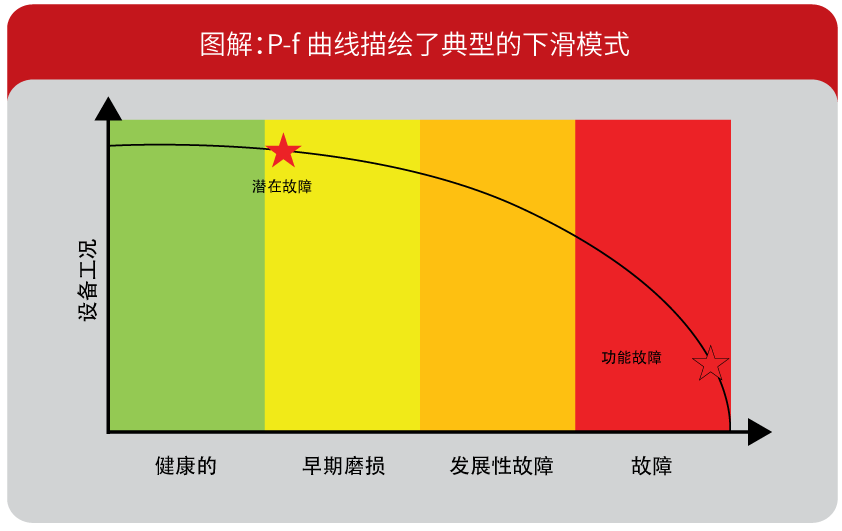基于工況的維護是利用獲取的數據監測現有設備的健康狀況。為此,要選擇關鍵參數作為識別發展性故障的指標。設備狀況通常會隨著時間的推移而下滑。P-f 曲線表明了典型的下滑模式。設備不能執行預期的功能時,就會發生功能故障。基于工況的維護就是要在故障真正發生之前檢測潛在的故障。規劃維護措施的優勢如下: