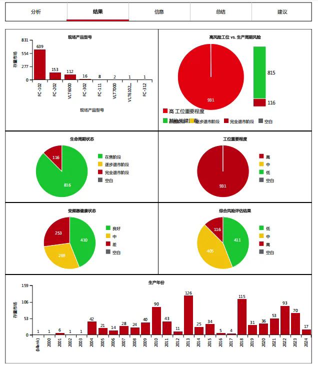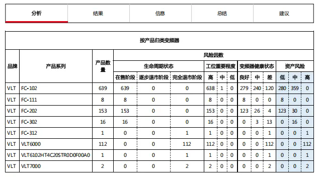 丹佛斯工程師帶領團隊,現場推進評估工作。依據現場評估所獲取的數據信息可知,當前該熱力公司在用的變頻器以丹佛斯FC102和FC202機型為主,有少量FC302和FC111機型,其中112臺已退市的VLT6000機型仍在使用,445臺變頻器已使用超過10年,253臺變頻器健康狀態較差。此次現場評估工作從變頻器健康狀態、生命周期、工位重要程度三個維度進行了分析,幫助客戶梳理變頻器臺賬,排查故障,為后續的設備維保改造與預算制定計劃提供了依據。